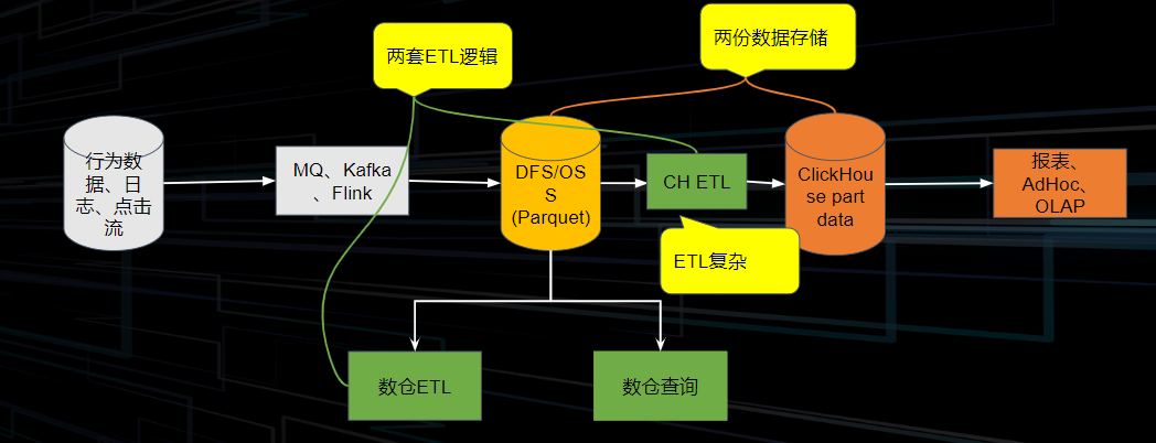 但有些业务需要从上述的存储中做一个分支,因此会在数据分析的某一阶段,从整体链路中将数据导出,做一些不同于主链路的 ETL 操作,会出现两份数据存储。其次在这过程中也会出现两套不同的 ETL 逻辑。