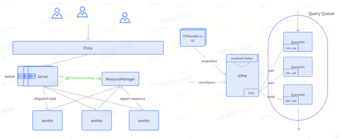 我们直接在 server 端做了一个 manager。每次查询的时候 manager会去check 集群的资源,并且持有一个锁。如果资源不够用,则等待资源释放后去唤醒这个锁。这就避免了 Server 端不限制的下发计算任务,导致 worker 节点超载,然后崩掉的情况。