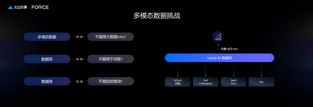 近期在北京举行的火山引擎FORCE原动力大会上,LanceDB CTO徐磊进行了《LanceDB:AI时代的多模态数据湖》专题分享,展示这一合作如何帮助企业简化AI数据架构,让研究人员专注于模型创新而非底层工程。