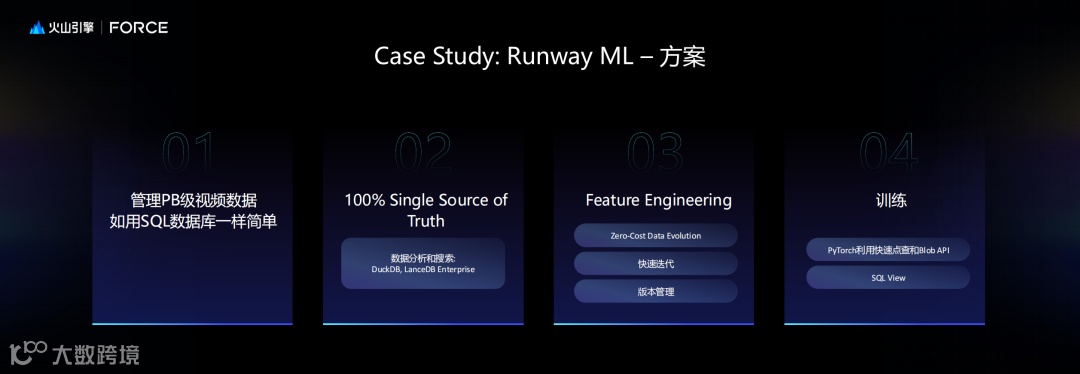 在与LanceDB合作后,Runway ML将数十PB的视频训练数据迁移至Lance格式,通过支持SQL查询和简洁的Python DataFrame API访问和分析海量数据。