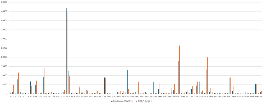 在OLAP场景中,以TPC-DS数据集测试为例,通过将模拟生成的 1000G 数据导入测试产品,在 99 个查询中,ByteHouse 对比行业某主流开源产品D*,整体查询性能达到该产品 1.16 倍。