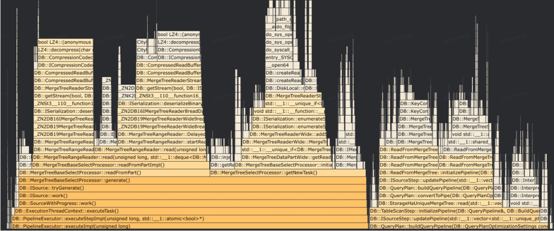 在下图中有很多decompress函数,对于通用的OLAP引擎,读一行数据通常也需要读取大量的block,再将block解压反序列化成内存格式,需要消耗大量的CPU资源。在高并发的场景下,点查读放大的问题更加突出。