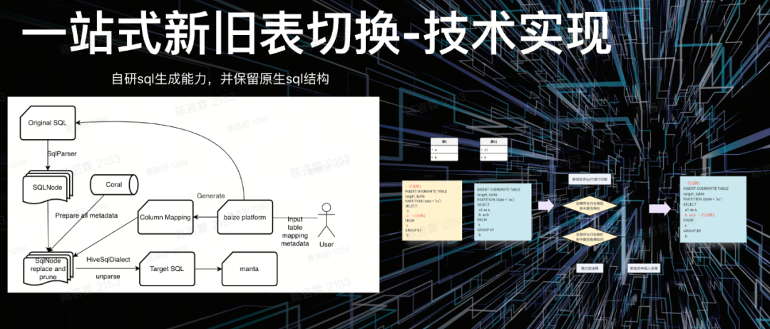 下面介绍技术实现。用户输入需要切换的旧表之后,平台通过旧表的产出任务进行解析,获取语法树文件,并基于语法树文件做裁剪、替换。基于用户输入的新旧表映射关系生成切换后的SQL,再提交到比对平台,最终完成整体比对。