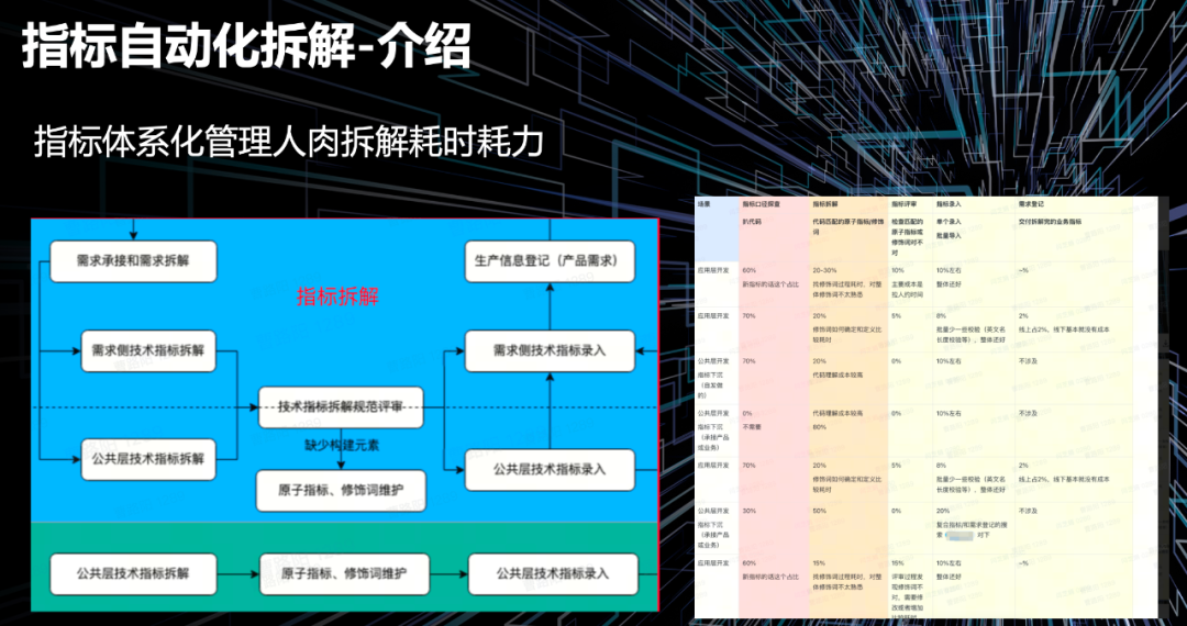 在该过程中,通过进行用户调研,我们发现,在做拆解的过程中,用户有几个核心环节,如通过字段口径了解字段真实的来源链路,同时还要看字段整体的加工逻辑,再人工用该SQL做拆解工作。最后,用户在指标平台里面维护好元信息。应用层的指标开发完成之后,再去评审最终拆解结果的质量。