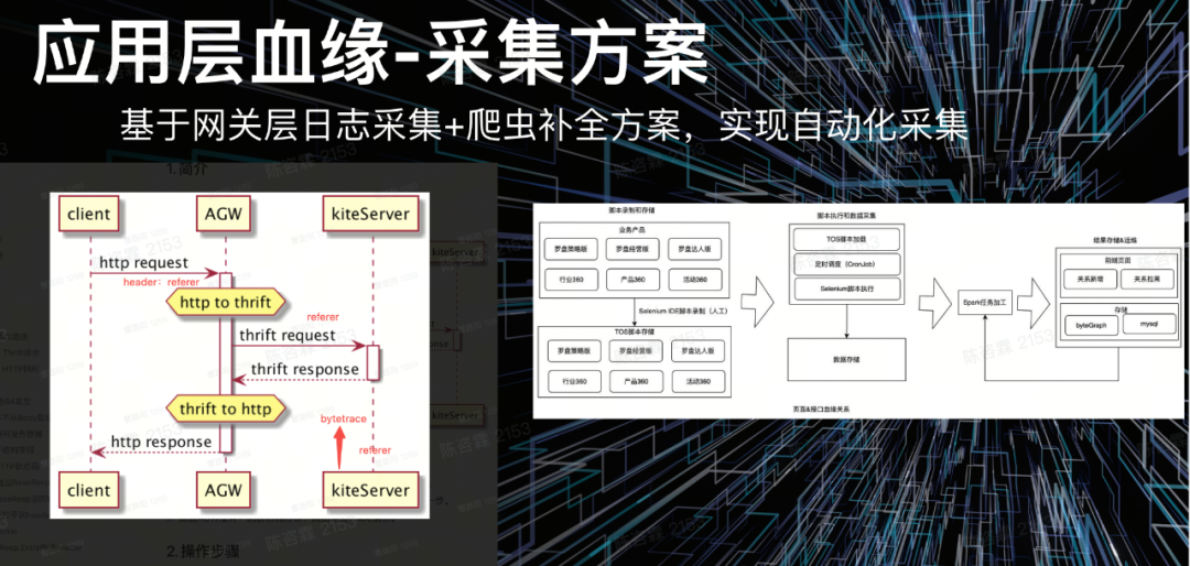 对于数据链路血缘来说,我们针对异构数据源的SQL进行解析,在数据平台上维护了很多丰富的元数据,可以更好解析数仓之间的链路关系。但是对于应用层则不同,在电商场景中,我们维护了很多数据应用,如果逐一推进应用接入全链路血缘能力,成本很高。数据流转是从产品页面经过HTTP或者thrift接口请求后端服务,经过数据服务层打到数仓底表。