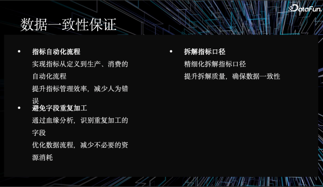 在数据一致性方面,通过全链路血缘等手段,我们实现了指标从定义到生产消费的完整自动化流程,提升了指标的管理效率,减少了人为失误。通过血缘分析加解析能力,我们能识别出重复加工的字段,优化数据流程,从而减少不必要的资源消耗。