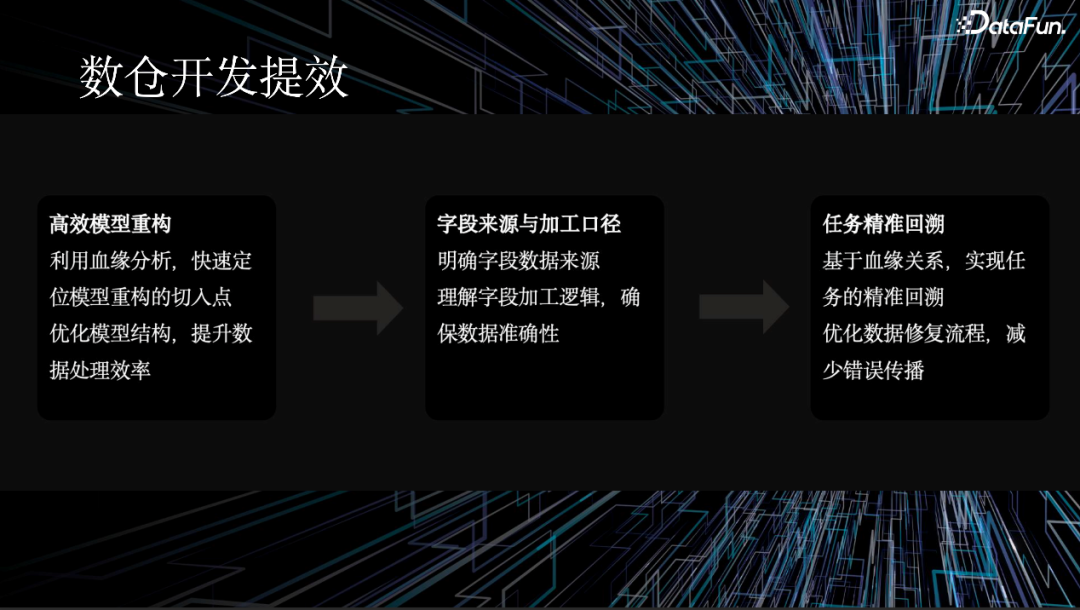 第三,数仓研发提效。我们希望通过数据血缘及时完成表重构,理清字段的来源以及加工口径,并且进行任务精准回溯。