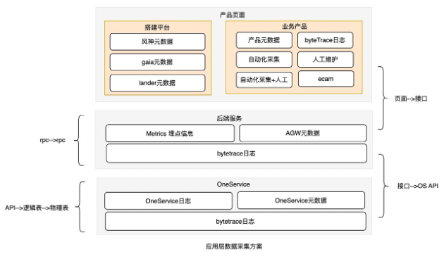 右图将该过程划分层级,通过低代码平台搭建前端页面、业务产品页面、数据产品页面,再通过接口的形式请求后端服务,最终映射到在one service上,形成对应的API,其底层就是刚才提到的数仓链路的血缘。