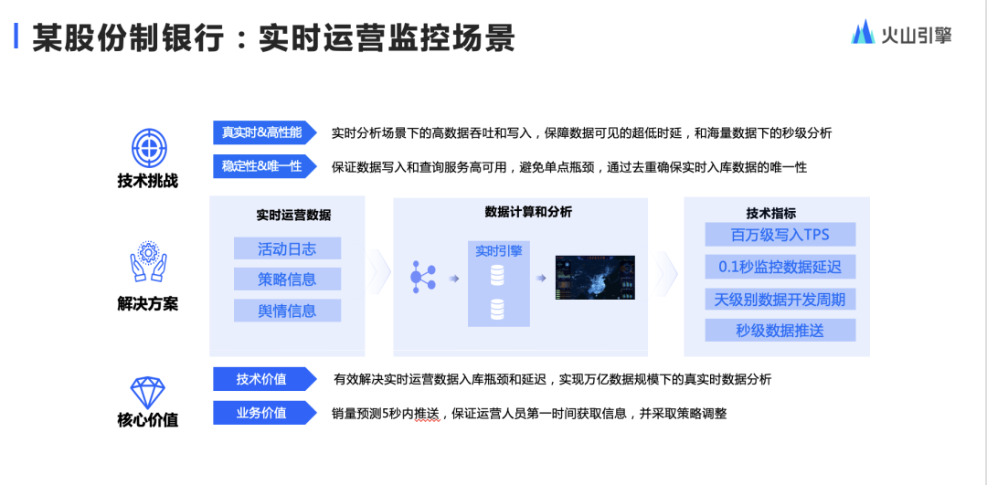第一个案例,Bytehouse帮助一家股份制银行做实时运营监控的业务场景,通过各种数字化的工具,来促进银行用户的增长,实现数字运营的闭环。