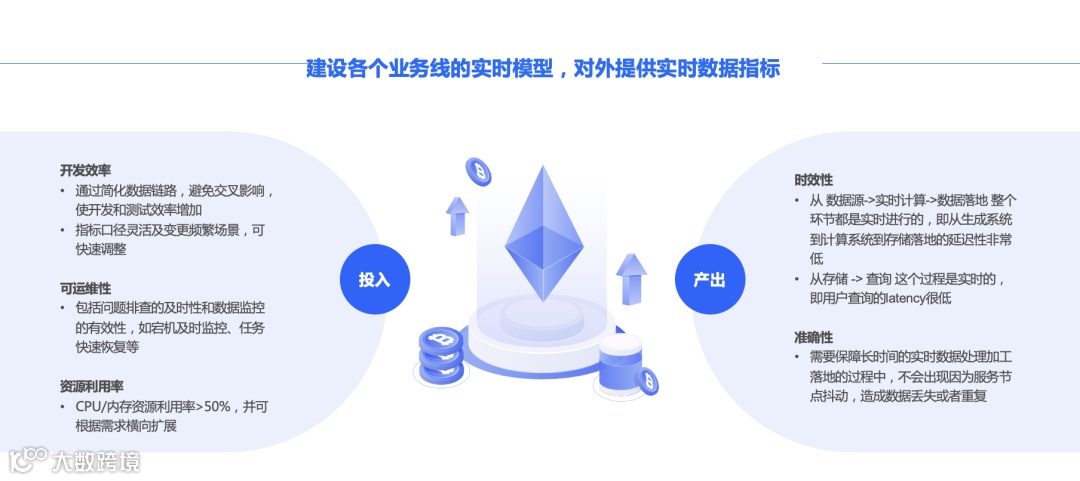 从产出的角度来看,相比起离线数仓,实时数仓更具有时效性和准确性。时效性,是指从数据源到数据的计算,再到数据的落地可查,这个过程都是完全实时的,而且保证时延是最低的。当数据落盘之后,用户需要的每一条查询尽可能的快。而从准确性来说,不管多么复杂的数据加工链路,实时数仓都不会因为节点抖动或其他问题,导致数据的重复或者丢失。