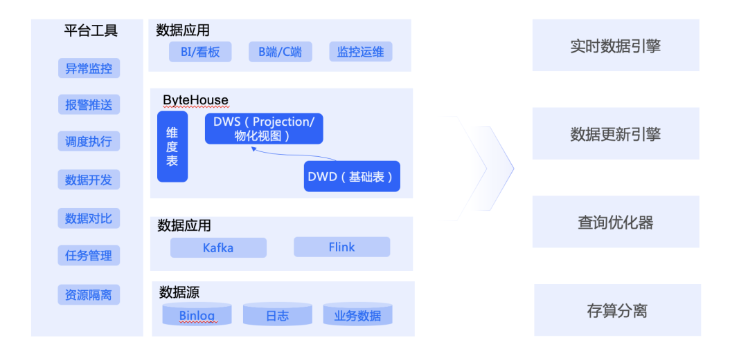 从上图来看,各种各样的数据源都可以通过Kafka或者Flink写入到ByteHouse里面,然后来对接上层的应用。按照数仓分层角度,Kafka、Flink可以理解为ODS层,那ByteHouse就可以理解为DWD和DWS层。