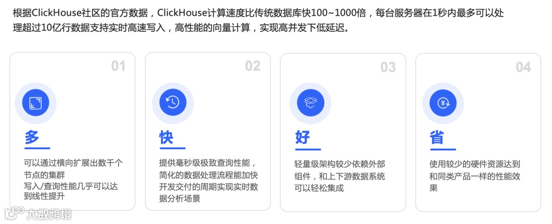 首先,ClickHouse的性能很快,尤其在单表场景下,它能提供非常快速的查询性能,这也是很多用户选择它的原因之一。其次,ClickHouse可以通过增加机器资源,去提升具体写入和查询的性能,基于已有架构,ClickHouse可以实现非常好的非侵入式部署,不管是前面是大数据平台数据湖,后面是什么样的BI应用,ClickHouse都可以和上下游去做到无缝的对接和整合。最后, ClickHouse硬件资源的利用率也比较高,可以用更少的硬件资源来达到一个同类产品的效果。