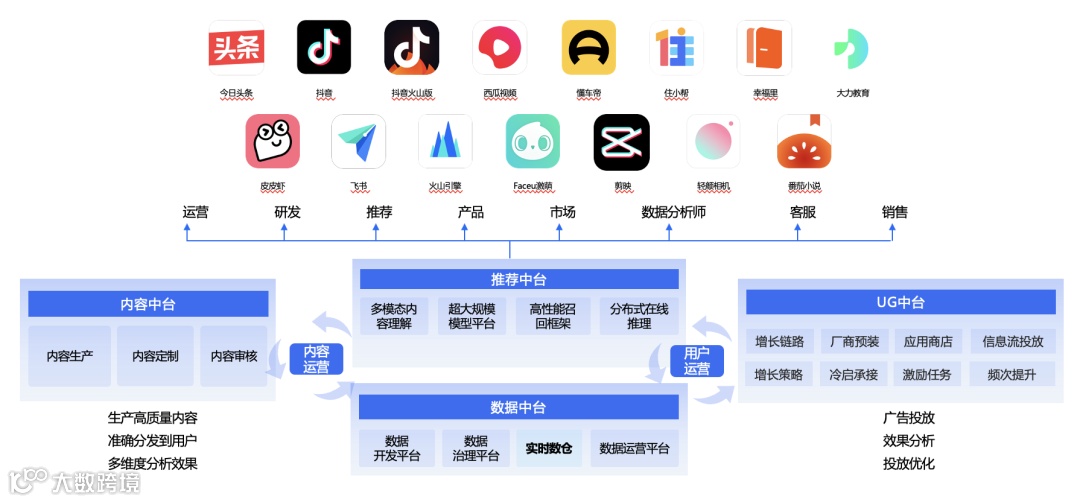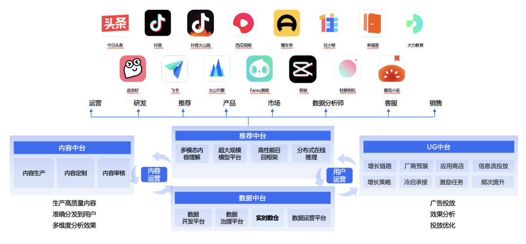 在字节跳动内部,不同的业务线及产品背后,其实是有着大量的中台在进行支持。以抖音和今日头条为例,从内容运营的角度,核心逻辑是怎么样把优质的内容生产出来,准确地分发到不同的用户并且及时的收到反馈,以此来不断形成一个迭代闭环。从用户运营的角度,是该怎么样去协助客户进行有效的广告投放,让他们能够精准地触达到目标用户。