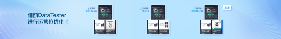 原有的运营位展示的是洗衣机“清洁产品+耗材”,在设计AB实验过程中,业务团队新增了两个方案,仅展示“清洁产品”方案和展示“清洁服务+产品”的方案。他们使用火山引擎DataTester开启实验,在实验运行10天后,通过对点击率、转化率等指标的观测,实验表明,“清洁产品+清洁服务”的组合方案胜出,点击率提升近40%,且数据呈现显著性。