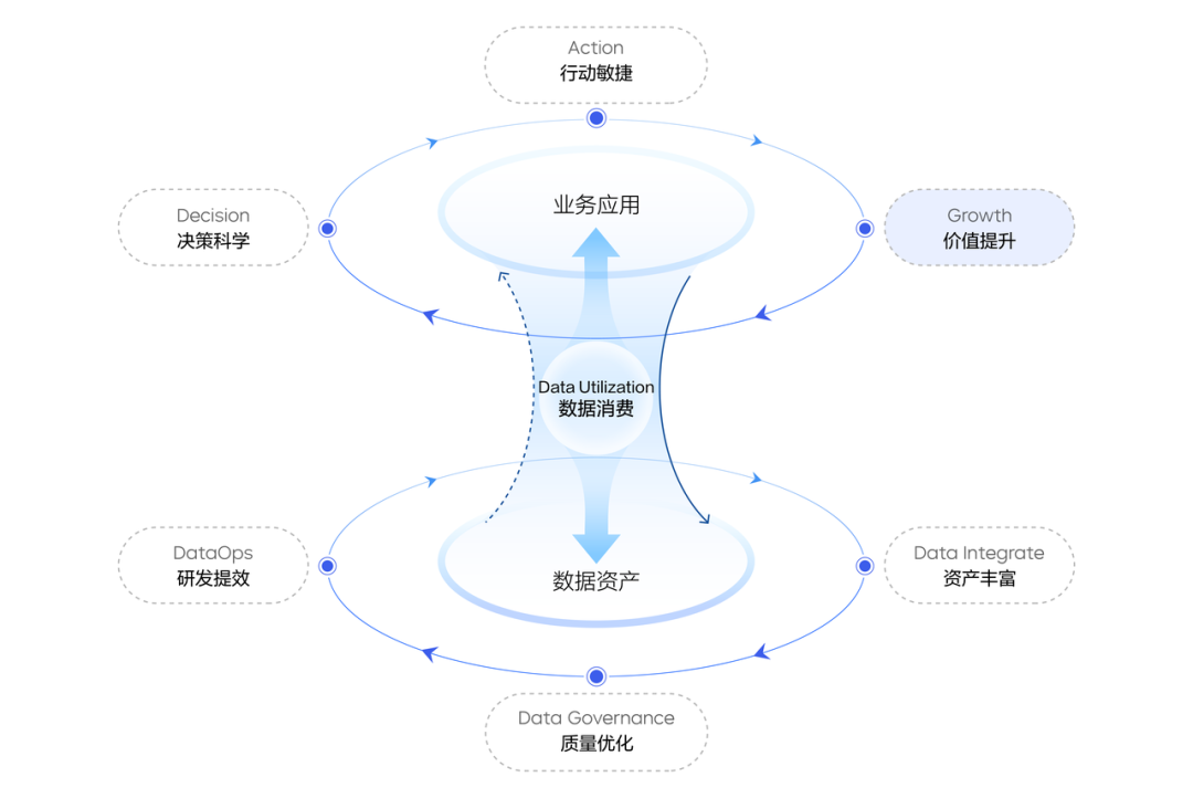 数据飞轮的模式,旨在解决数据建设与管理成本高、数据产品使用门槛高、数据资产价值低的问题,让企业数据流充分融入业务流,实现数据资产和业务应用提升的飞轮效应,帮助企业激发员工创造力,增强业务战斗力,提升组织生命力。