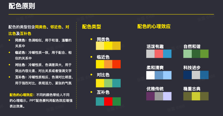 根据内容确定配色方案;根据主题确定主色、辅色及点缀色;尽量不超过四种配色。