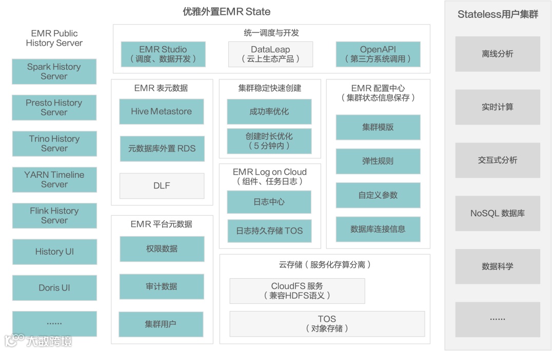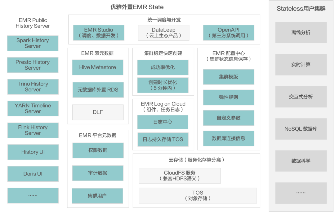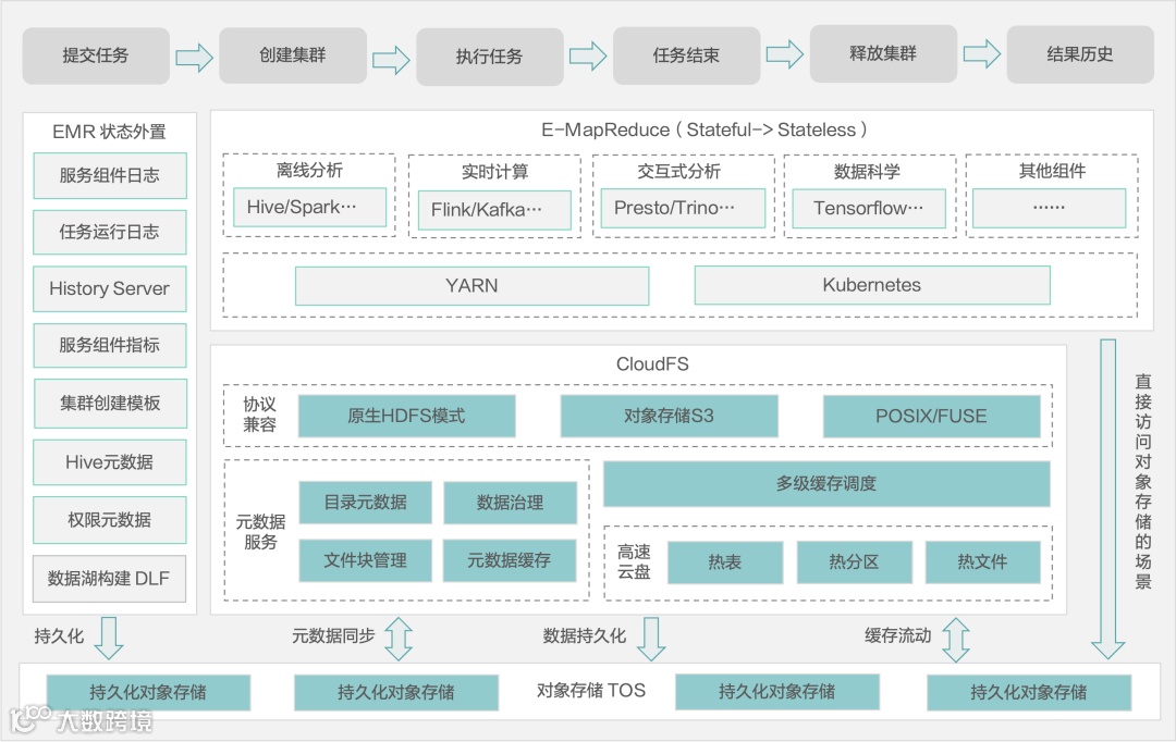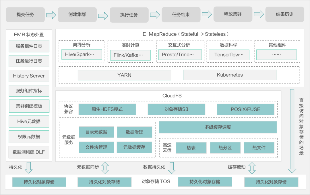 火山引擎 EMR 具备 CloudFS 和 TOS 两个数据存储层,冷数据可以存储在对象存储 TOS 上。CloudFS 则构建在 TOS 层之上,提供兼容 HDFS 语义存储,提供缓存加速功能,可以把温数据放在 CloudFS 。在引擎内部内置一些本地缓存,用于缓存热数据。分层缓存能够弥补企业上云之后,数据因保存在对象存储所造成的性能损失。另外 Cloud FS 提供 HDFS 的语义,可便于开源组件切入。
