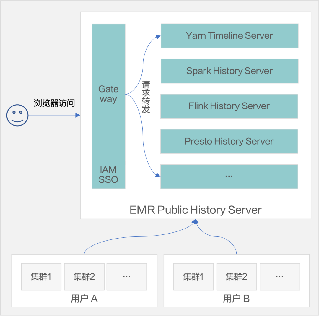 更友好的使用体验:相对于组件内置 History Server, 独立服务需要绑定公网并开放 8443 端口才能访问,Public History Server 真正做到了开箱即用,无需其它额外配置。同时集成 IAM SSO 准入认证,通常情况下用户从 EMR 管控端跳转到 Public History Server 可以实现无感 SSO 认证登录,无需再次输入用户登录凭证。