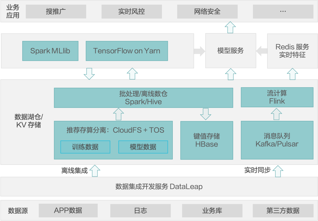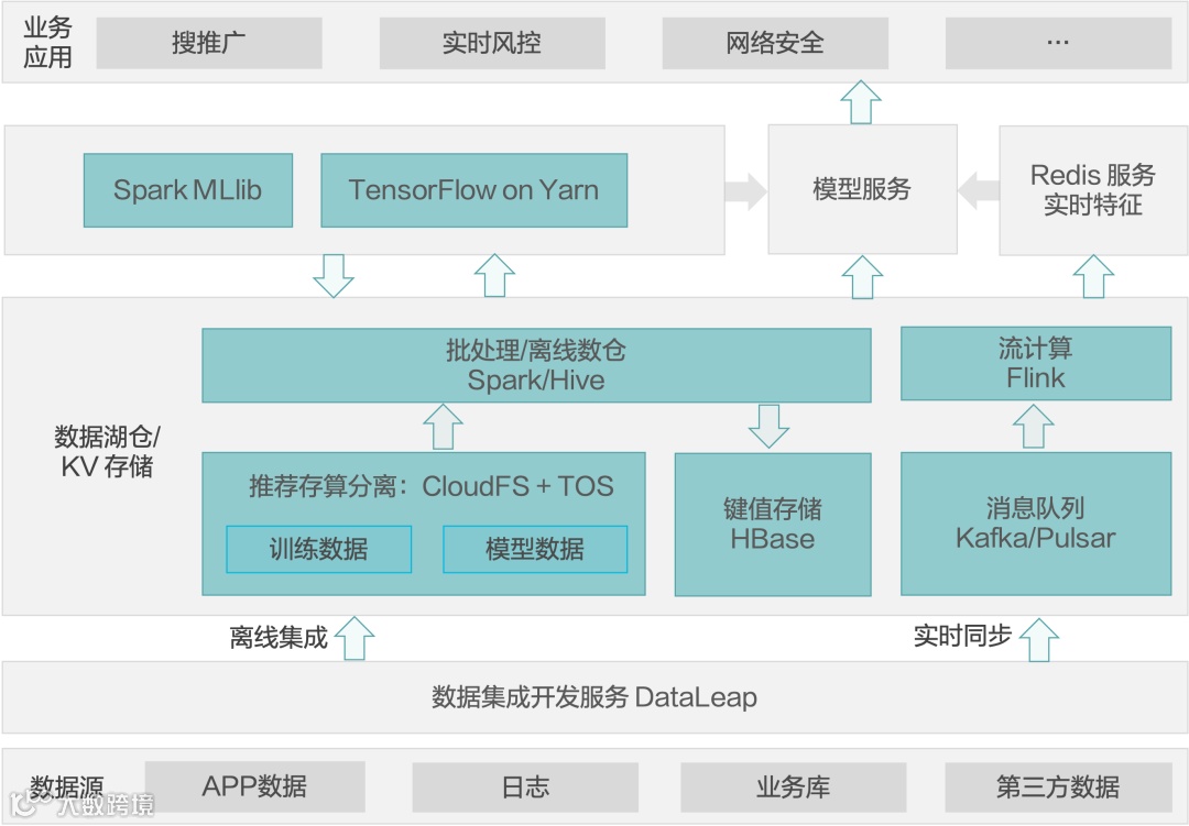 在在线机器学习场景下,数据通过离线的方式存到数据湖仓。离线数据可以通过 Spark 进行特征抽取及特征工程,并把提取出来的特征返存到湖仓或者 HBase 等键值存储。