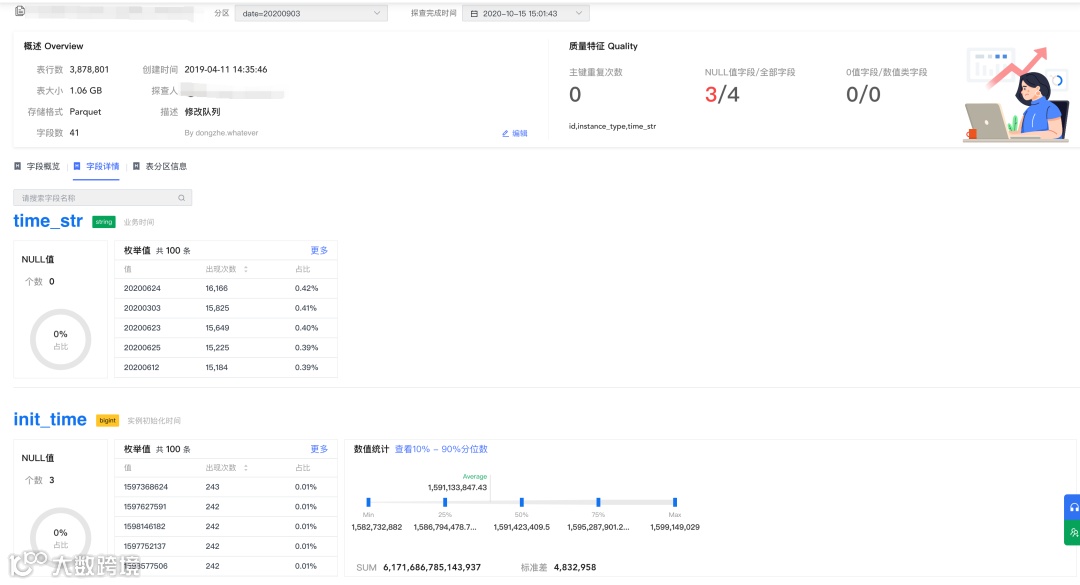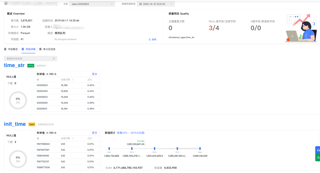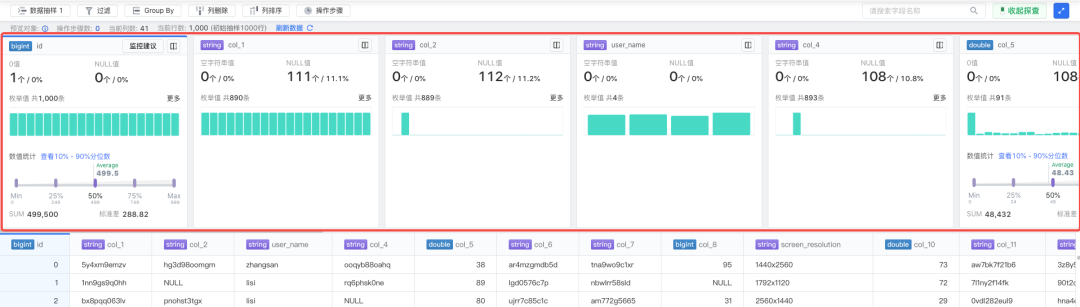 前端探查:实时探查,可视化展现数据分布,突出质量指标。