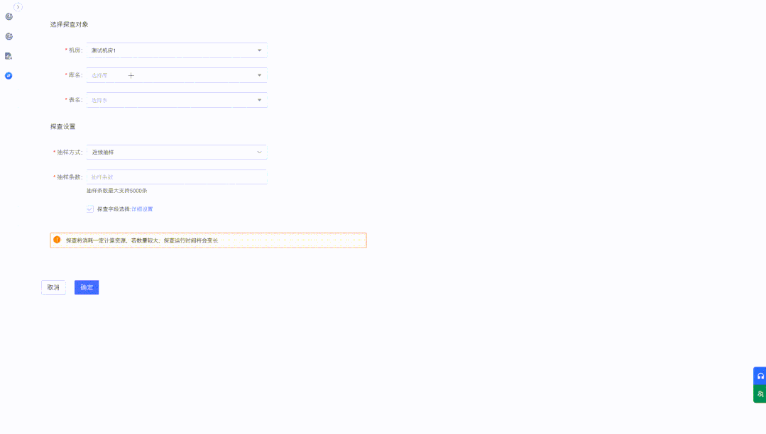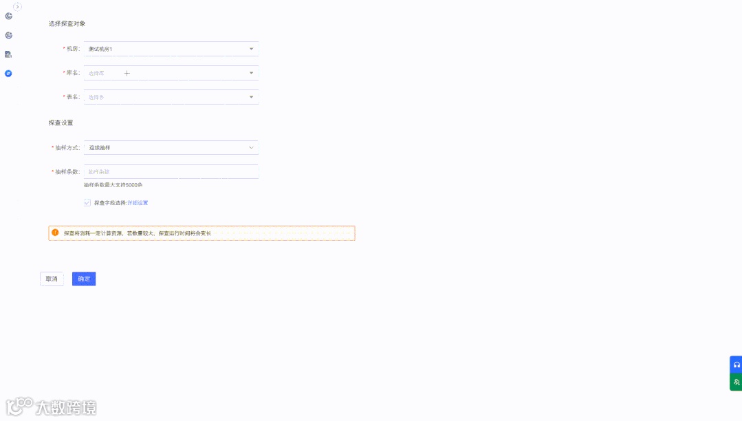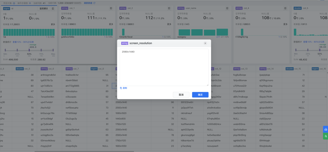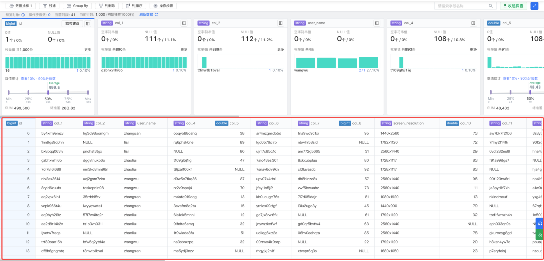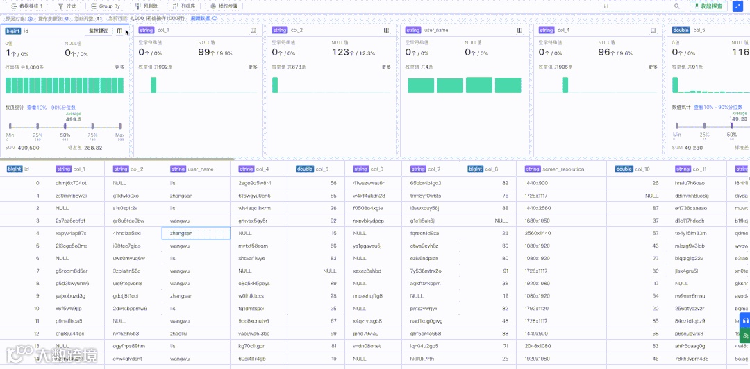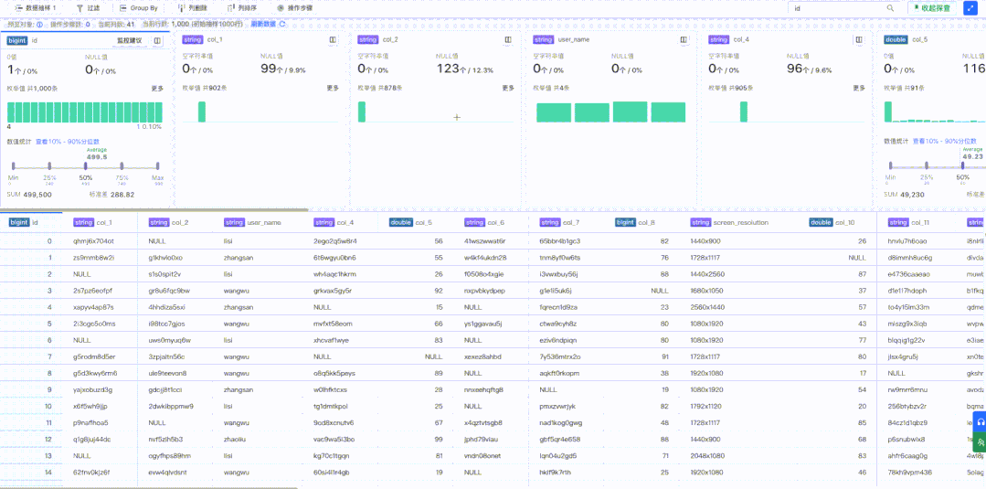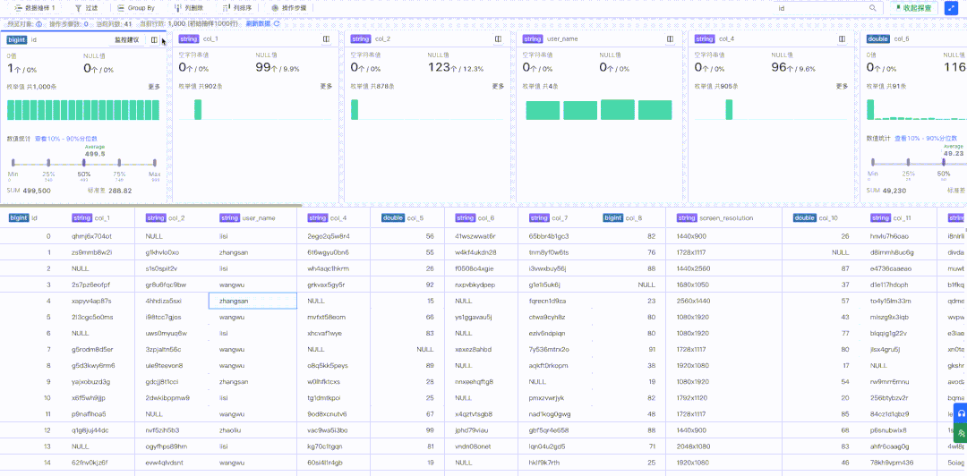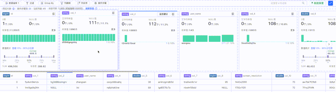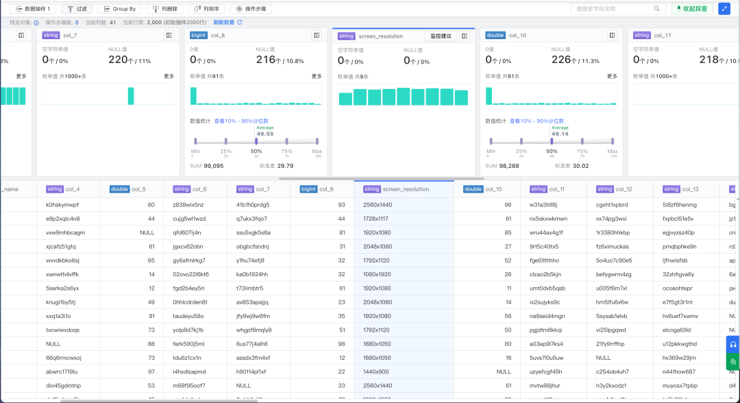 全量探查: 基于库表的全量探查,后端引擎执行,展示探查后列的统计分布结果。 动态探查: 基于抽样的部分数据探查,展示字段明细,可以使用操作对数据进行预处理,并实时动态的展示统计分布结果。数据获取后的过程都由前端执行。