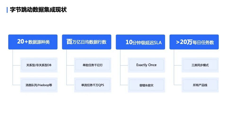 这套数据集成引擎如今在字节内部服务于众多产品线,每天的任务量超过 20 万,传输的数据行数超过百万亿行。其中单批任务达到千亿行、单流任务达到千万 QPS;支持 10 分钟级延迟 SLA。