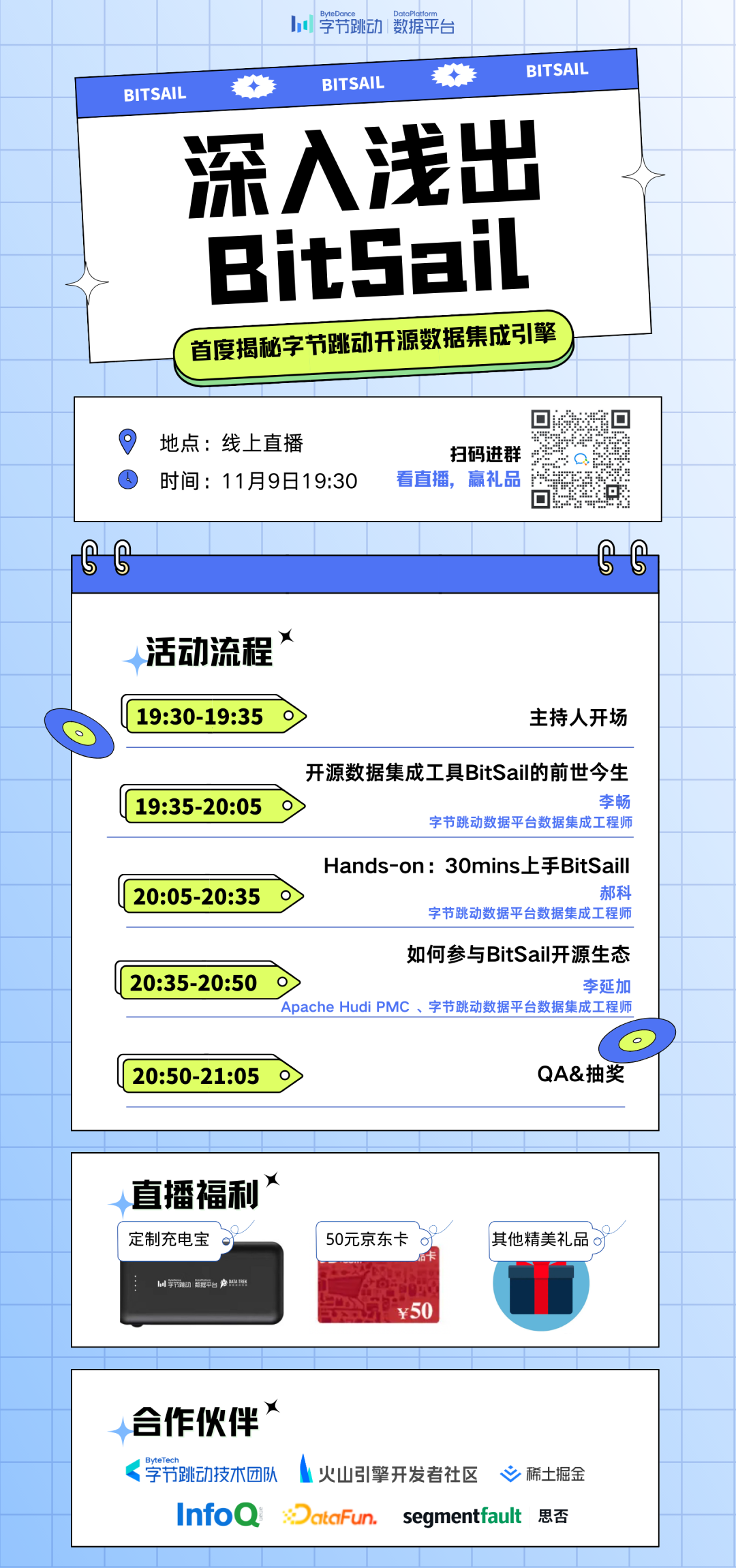 11 月 9 日 19:30,字节跳动数据平台举办 BitSail 首期直播活动,邀请数据集成领域专家,深入解读字节跳动数据集成技术实践与应用、开源项目规划和路径,更有工程师手把手教你如何快速上手。