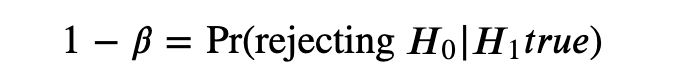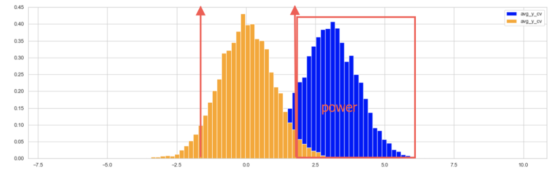 power 即 蓝色曲线在红色(右)箭头右侧的面积,即显著实验的概率。