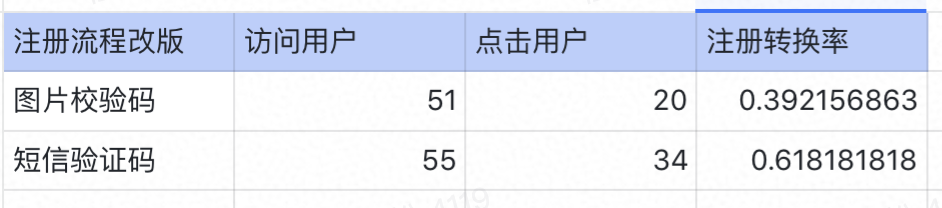 注册流程的A/B测试:之前是使用了图片校验码的方式,但是注册转化率偏低。提出设想:图片校验码方式改成短信校验码方式,是因为降低了用户输入的难度从而可以提高注册转换率。