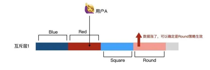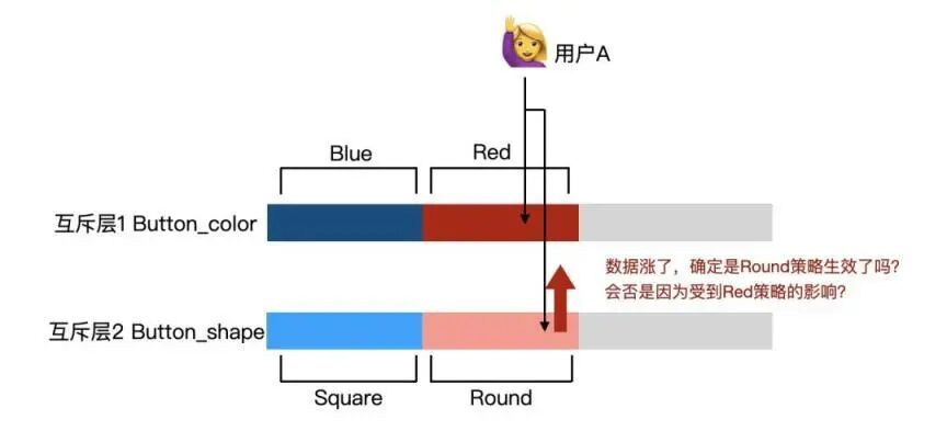 由图可知,用户 A 将受到“按钮颜色 Red”以及“按钮形状 Round”两个策略影响,我们无法判断究竟是哪个策略影响了该用户的行为。换句话说,由于两个实验存在关联,用户重复被实验命中,实验结果实际受到了多个策略的影响。这种情况下,两个实验的结果便不再可信了。