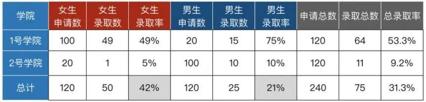 直觉上来说,许多人会觉得,男生录取率总体上会高于女生。然而事实并不是这样,让我们来看看实际数字: