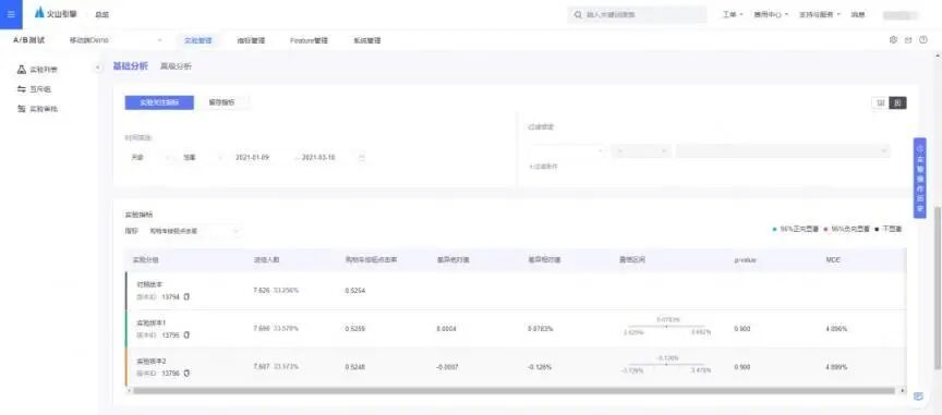 在统计策略方面,火山引擎 A/B 测试的统计策略长期服务于抖音、今日头条等产品,历经打磨,科学可靠;在实验报告方面,从概览至指标详情,火山引擎 A/B 测试依托于经典统计学的假设检验方法,结合置信度、置信区间,帮助实验者全方位的判断实验策略收益。