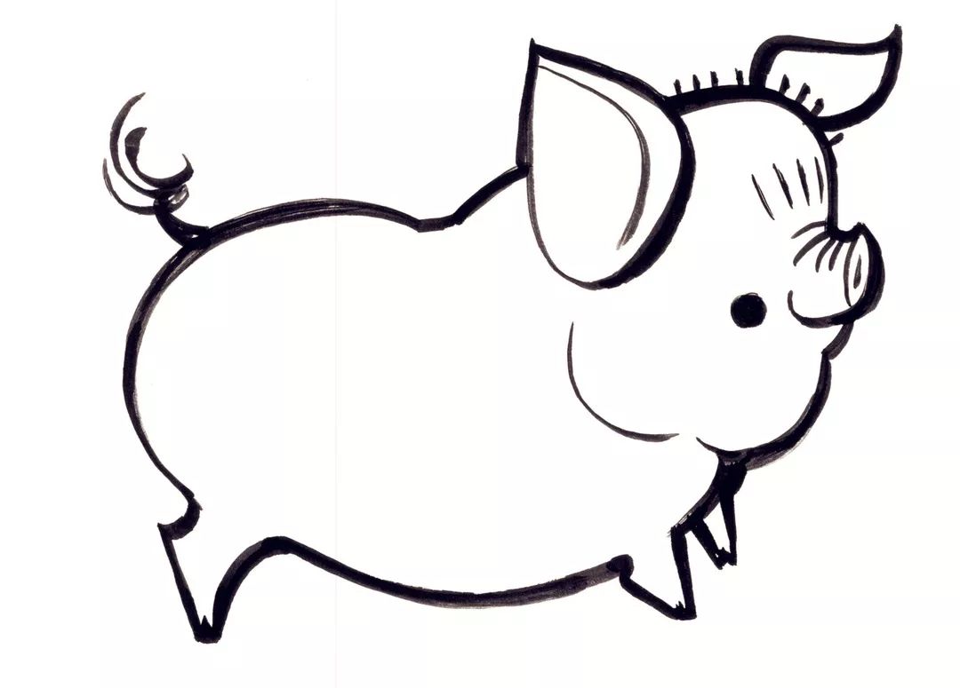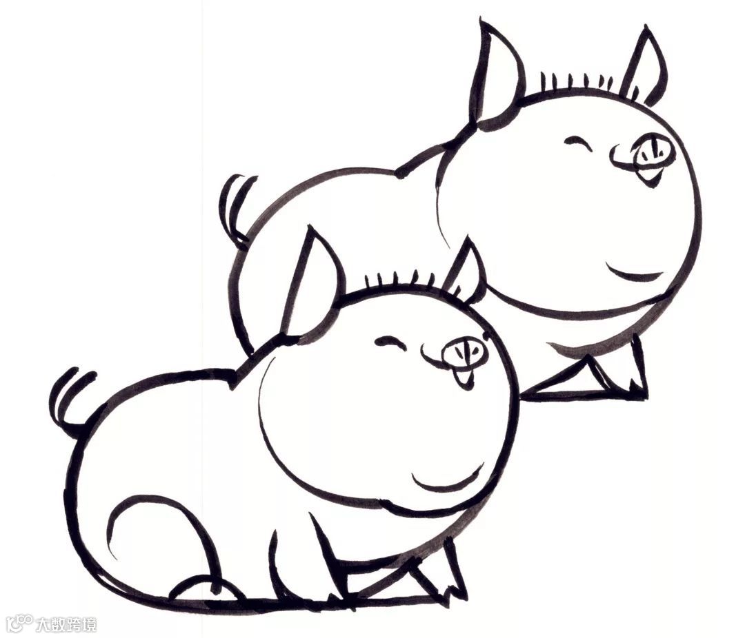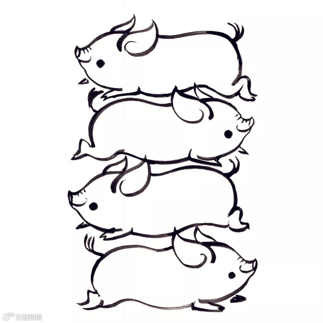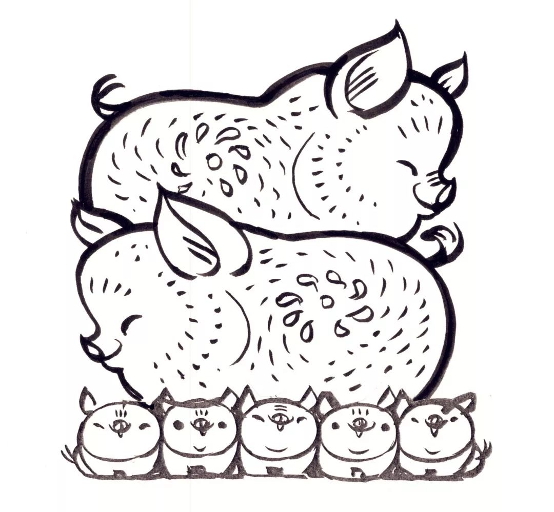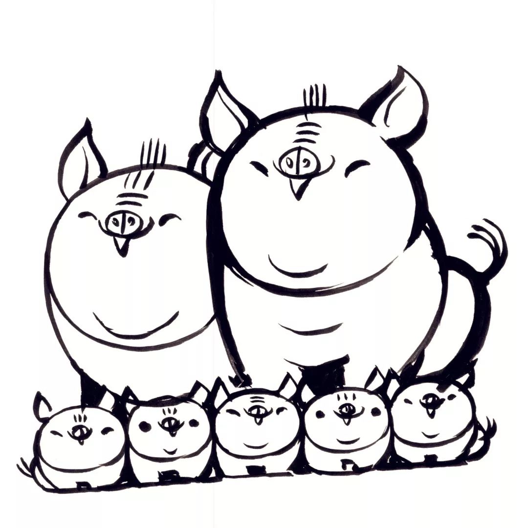 猪的各种姿态尽显画中:幸福半卧的猪、开心大笑的猪、乖乖站立的猪、撒欢奔跑的猪。