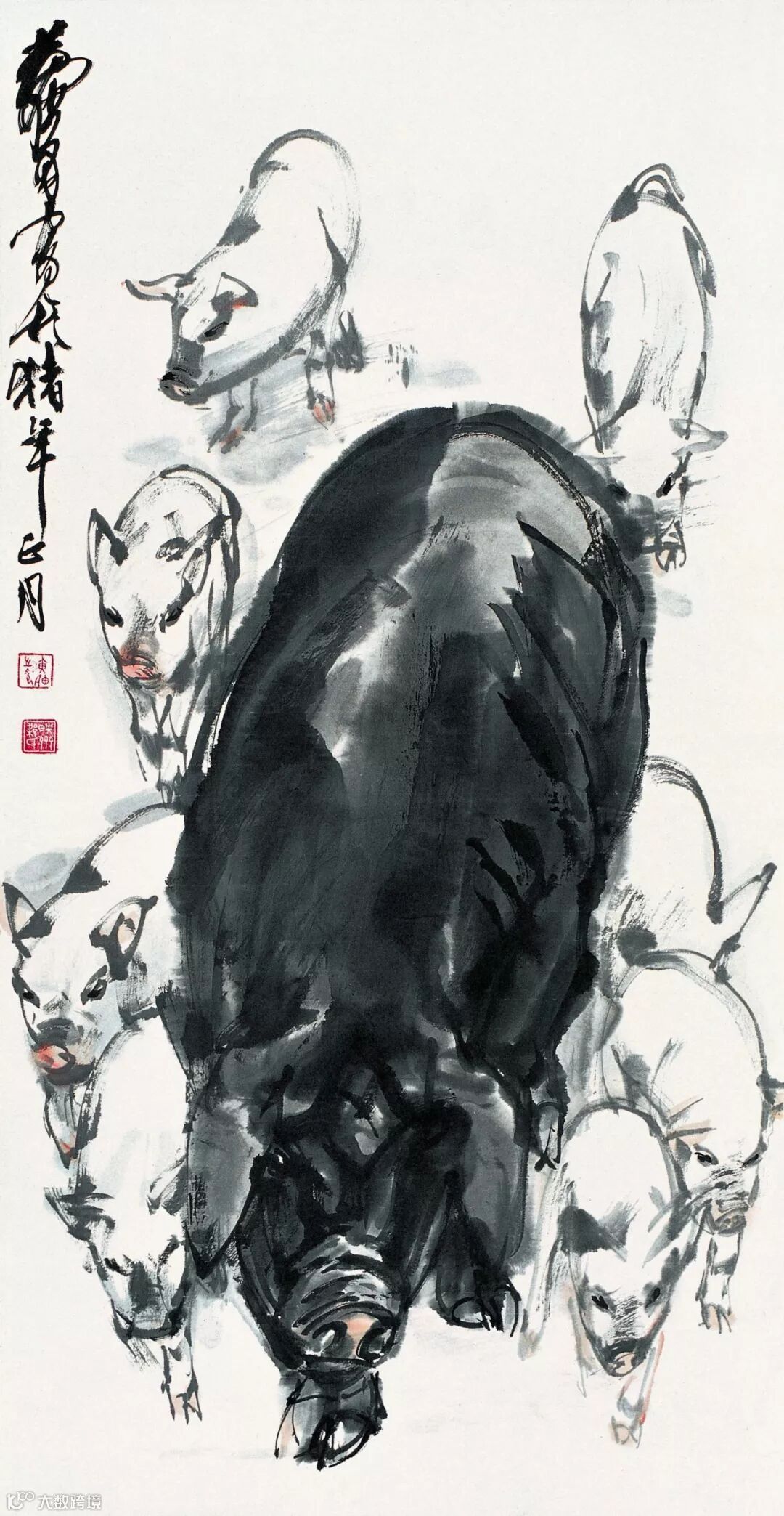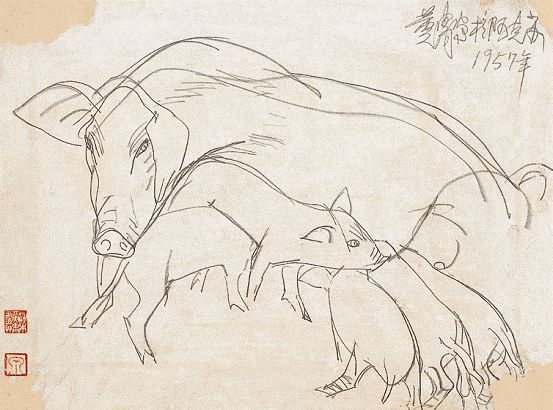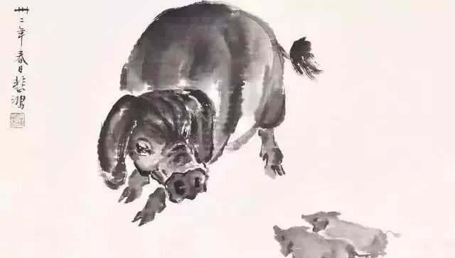 虽猪鲜入画,但看徐悲鸿用他那支挟雷霆万钧之力的笔,大笔淡墨、细笔勾画,将猪描绘得栩栩如生、气韵生动、匠心独具,或写意、或戏谑、或讽刺,皆有无尽的艺术价值。