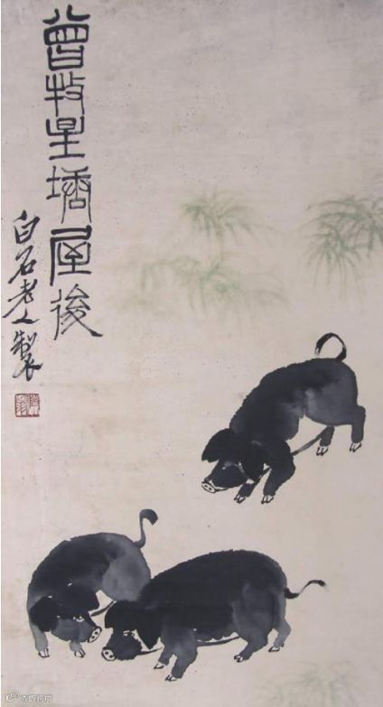 齐白石画的猪,栩栩如生、憨态可掬,将猪无忧无虑的样子,表现得真实、仔细。白石老人创作猪图的时间不同,造型也不尽相同,但看起来都真实朴素。艺术的真谛是平凡而简朴的,齐白石笔下的猪很好地体现了这一点。