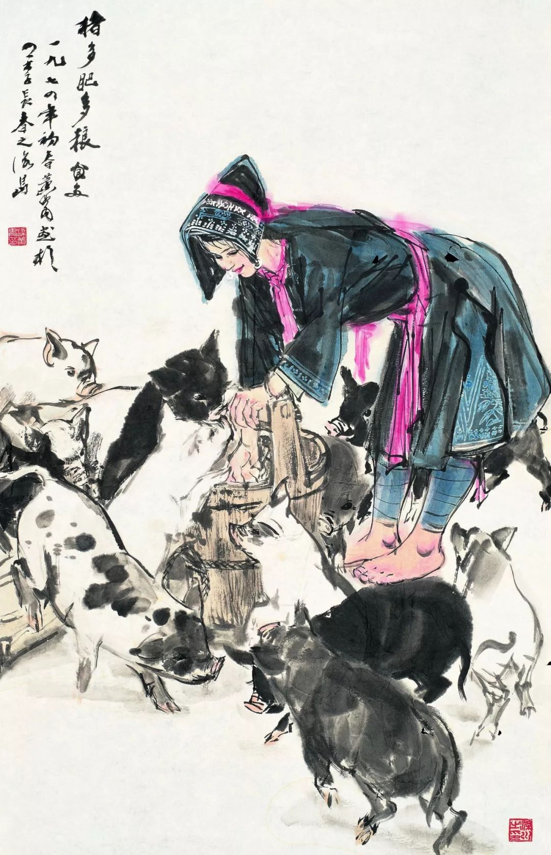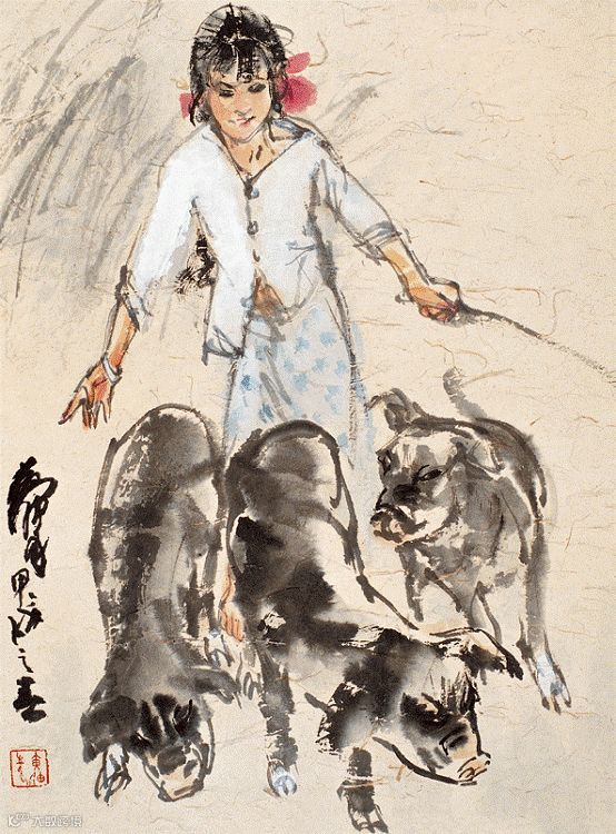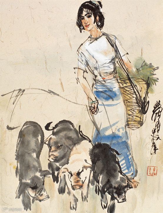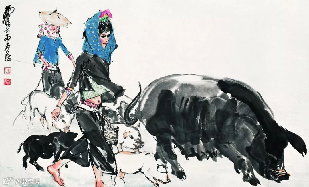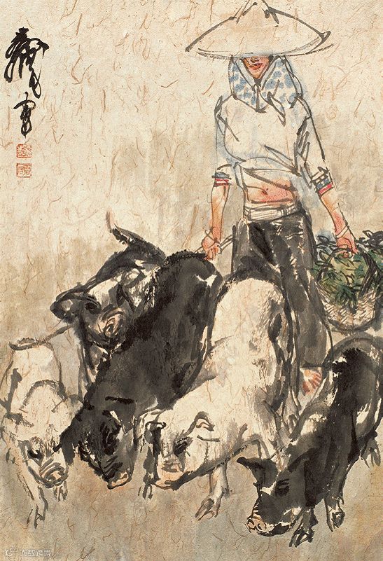 黄胄“牧猪”题材的作品,则是通过表现动物和人类的和谐共处,赞美生命的美和人类勤劳的品质。