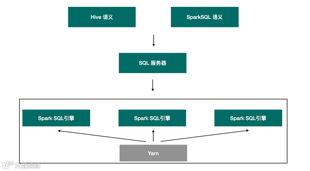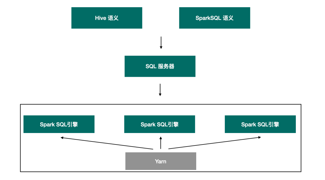 如上图所示,SQL服务器是一个实现了Thrift 接口的服务器,提供标准的JDBC访问接口,Spark SQL引擎同样实现了Thrift 接口,Spark SQL引擎在服务启动的时候便已经被提交至Yarn,处于等待状态。当业务任务到达的时候,由SQL服务器实现引擎的筛选,匹配一个已经存在的引擎,或者重新提交一个全新的引擎用来执行任务。