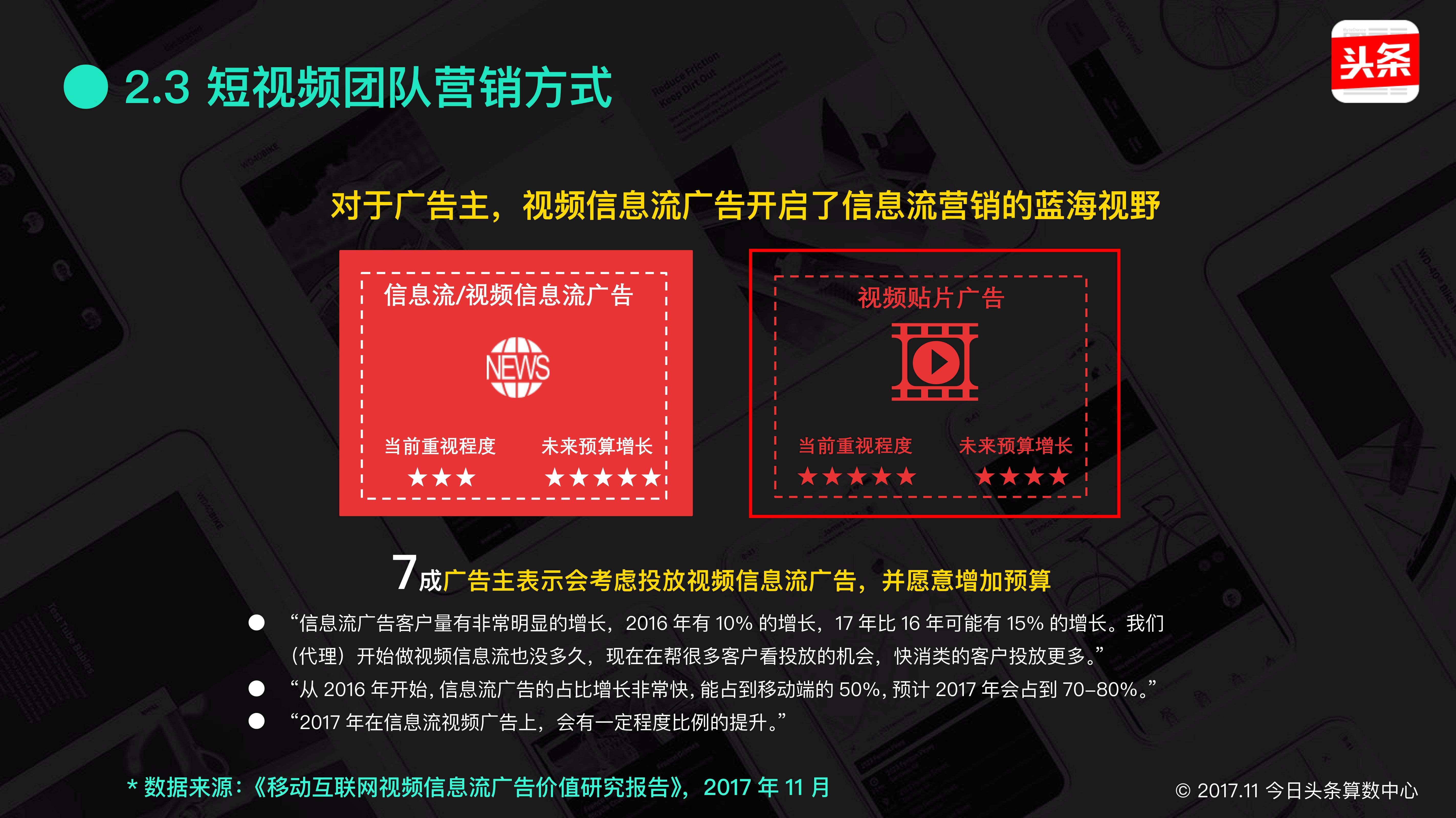 不过,不要慌,广告主爸爸对短视频的强大需求一定能让你重振信心,7成广告主愿意增加短视频上的投放支出。