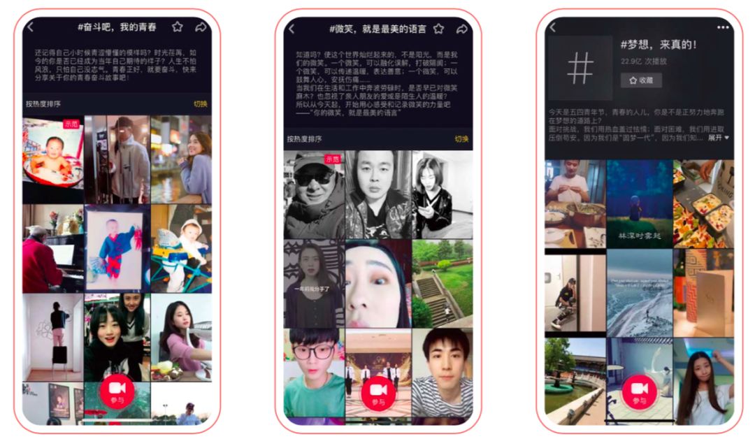 以抖音为例。抖音独具特色的挑战赛形式具有极强的感染力,用户发起挑战赛后便会成为示范者,而观众也只需一键点击立即参与即可参与短视频创作及传播。