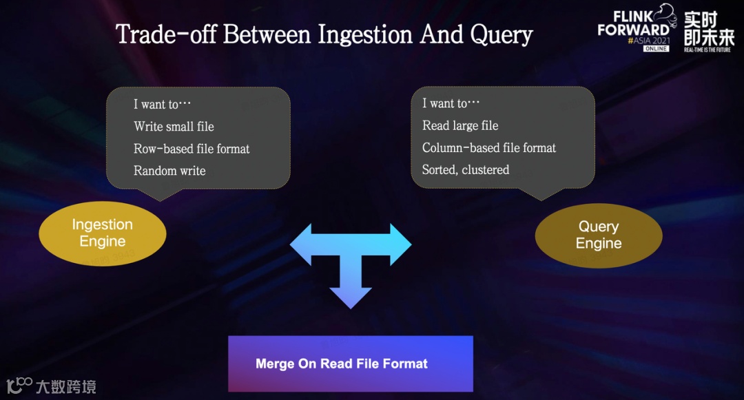 写入引擎更倾向于写小文件,以行存的数据格式写入,尽可能避免在写入过程中有过多的计算包袱,最好是来一条写一条。