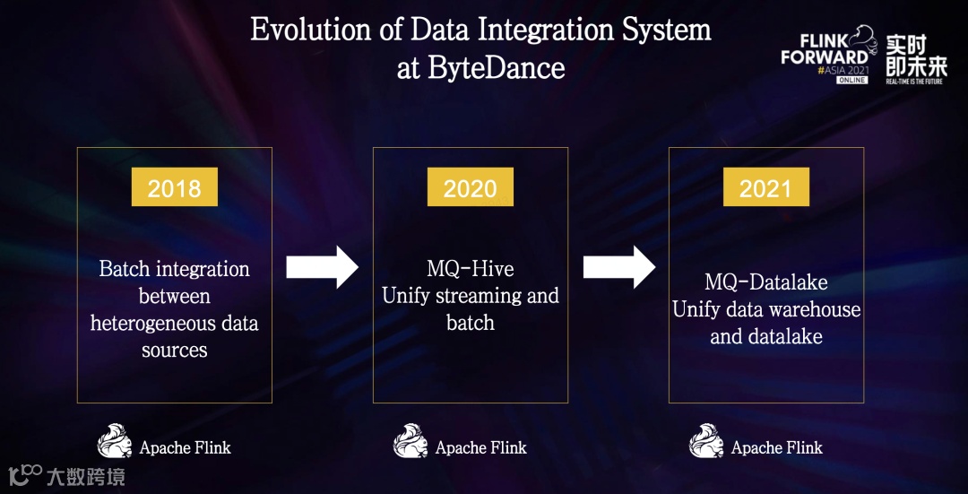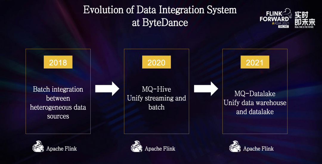 到了2021年,我们基于Flink构造了实时数据湖集成通道,从而完成了湖仓一体的数据集成系统的构建。