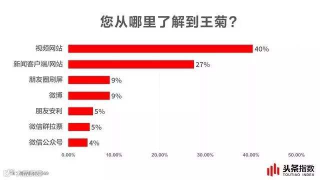 调研数据显示,40%的用户通过视频网站认识王菊,而超过一半的用户则是从各大社交平台传播及新闻资讯了解到她。其中,36%的用户是从新闻客户端、网站等渠道了解到王菊相关资讯,可见在王菊爆红后,网络自媒体蹭热点式的资讯让更多的外围用户卷入到这次事件中来。