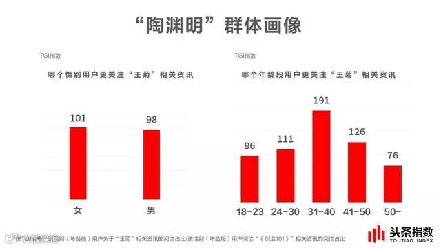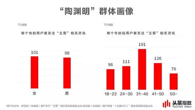 首先,从资讯性别指数看,菊姐更受女“陶渊明”的关注,而相对于关注《创造101》的粉丝来说,95前的“菊姐”更受到“阿姨”们的关注,可能菊姐在比赛中表现出来的独立女性的魅力引发了她们关注。