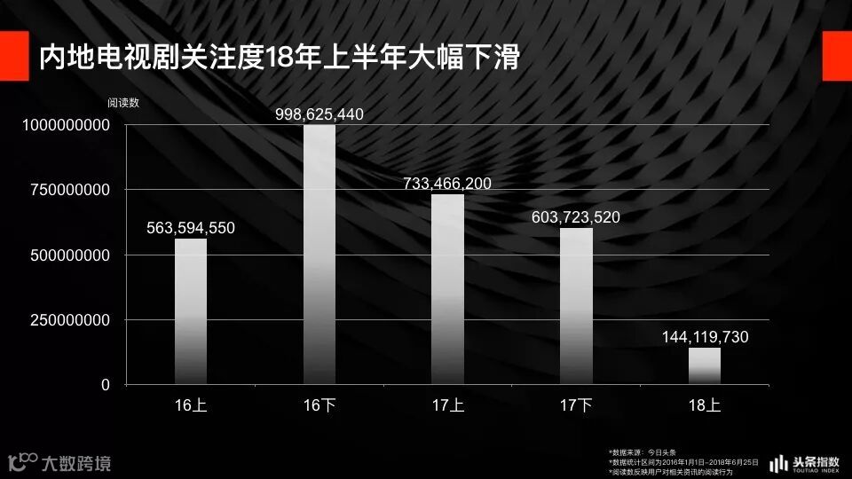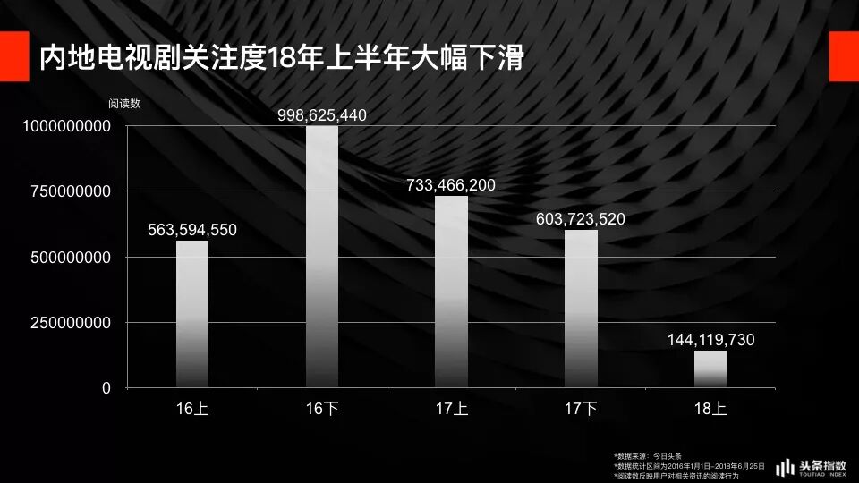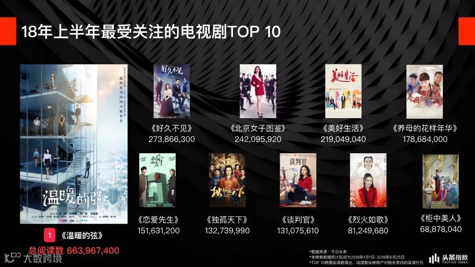 《温暖的弦》、《北京女子图鉴》等热门电视剧热度虽高,但都没有形成全民性质的爆款,2018年上半年内地电视剧的整体关注度大幅下滑。