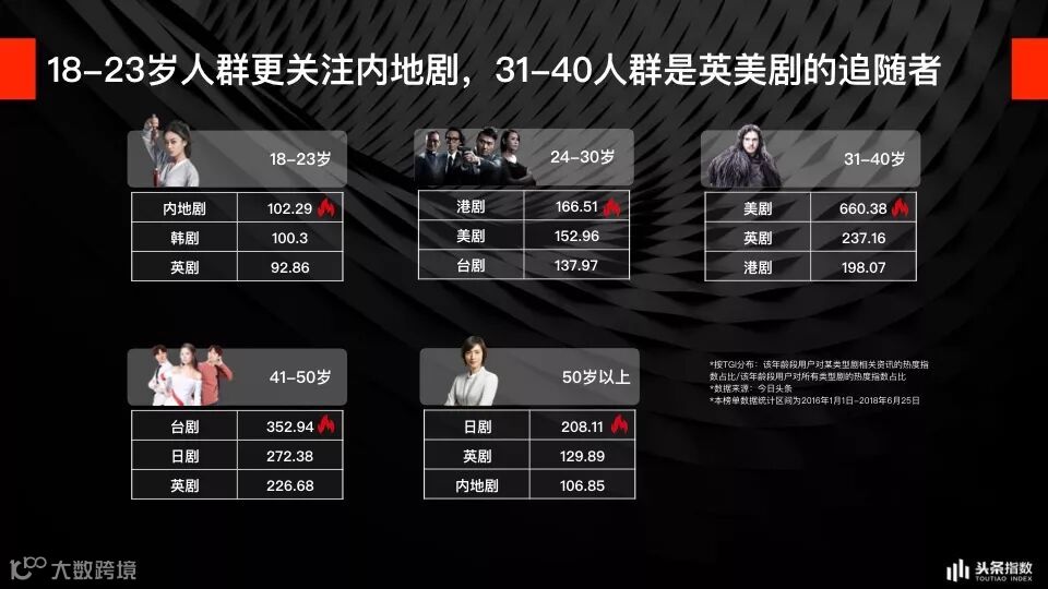 从年龄分布来看,18-23岁人群更关注内地剧,31-40的成熟人群是英美剧的追随者。