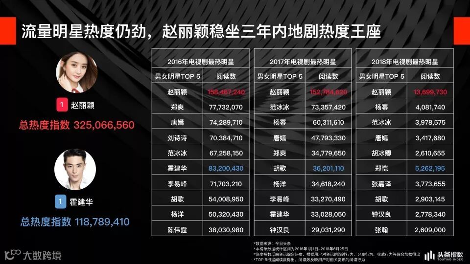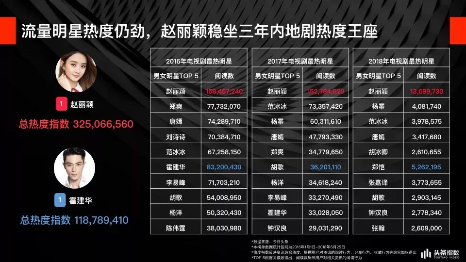 头条数据显示,赵丽颖是2016年以来当之无愧的电视剧流量女王,三年热度远高于第二名,霍建华成为三年总热度最高男星。相比女明星相对稳定的流量排名,男明星的排名则起伏较大,胡歌是三年连续上榜的男明星,2018年TOP 5中也出现了张嘉译这样的老戏骨。