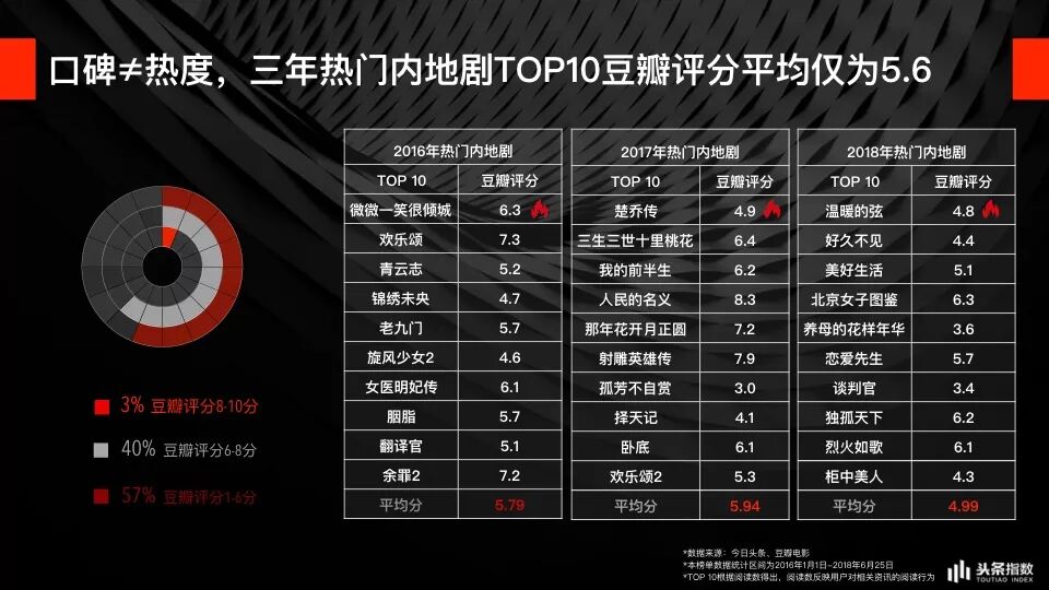 头条指数根据2016年至2018上半年每时间段的用户资讯阅读量,评选出年度热门内地剧TOP 10。从豆瓣评分数据看,2016年至2018年上半年的热门内地剧TOP 10评分整体偏低,由于《人民的民义》、《那年花开月正圆》、新《射雕英雄传》等剧的拉动作用,2017年热门电视剧TOP 10豆瓣评分平均分最高,为5.94分,2018年上半年平均分则低至4.99分,内地电视剧整体质量堪忧。
