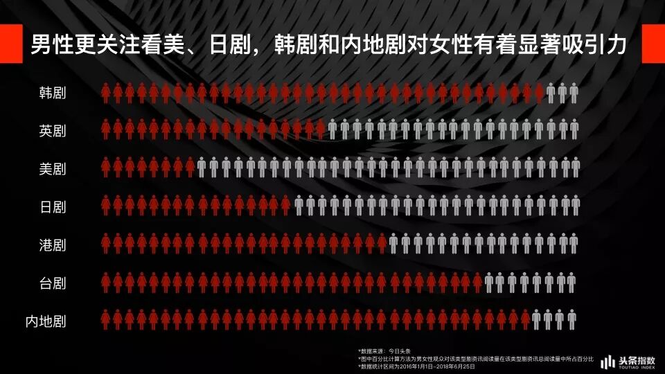 从性别来看,男性更关注美剧和日剧,韩剧和内地剧对女性有着显著吸引力。
