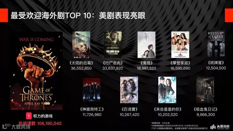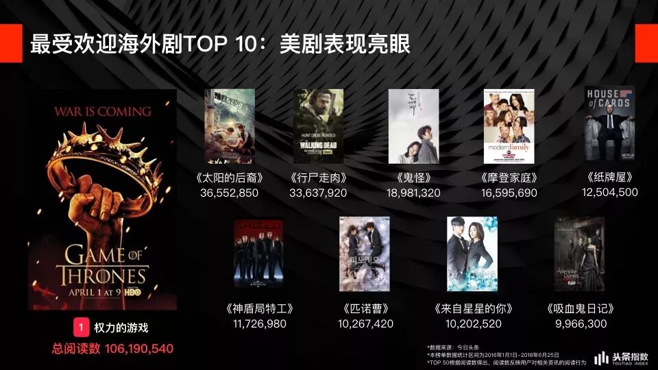 作为美国流行文化的重要符号,美剧因多元的选材与类型、精良的制作等优势占据了绝大多数海外剧流量,《权力的游戏》是最受中国观众欢迎的海外剧,热度远高于二三名。此外,韩剧虽然少了季播型电视剧的热度优势,但《太阳的后裔》、《鬼怪》等优秀韩剧与美剧一起占据了中国观众最关注的海外剧榜单TOP 10。