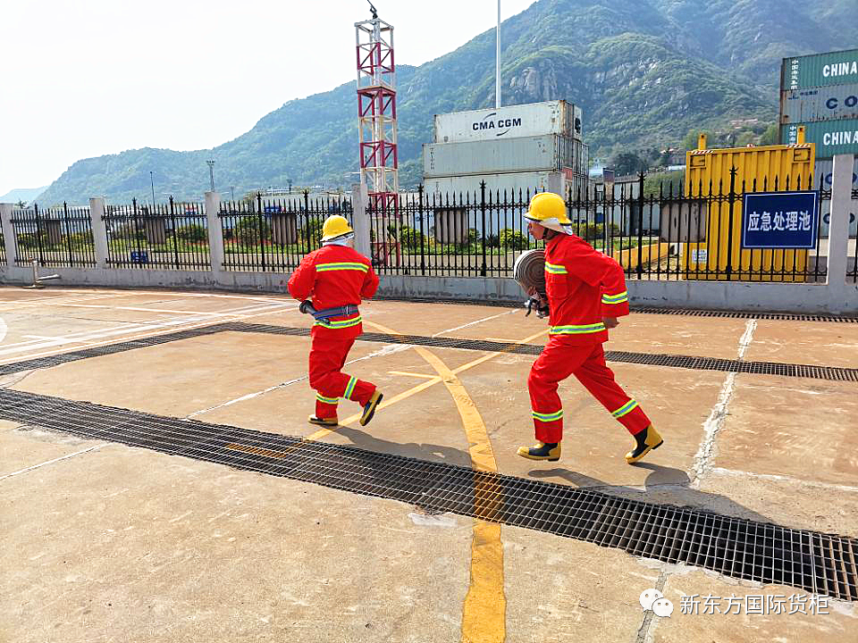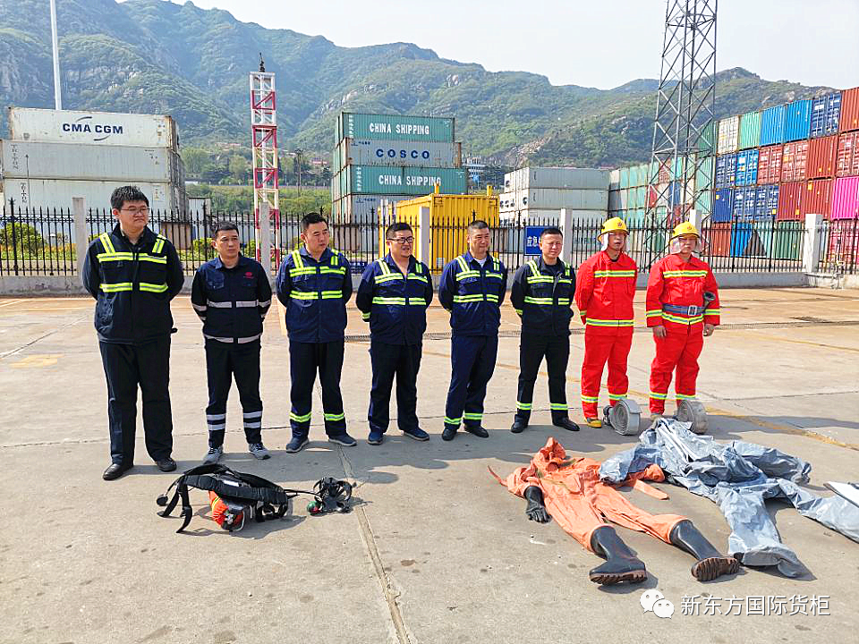 该训练内容为模拟危险品堆场发生危险货物泄漏及火灾,危险品班组员在发现险情后,第一时间启动应急预案,穿戴应急防护器材进行危货泄漏及火灾初期的应急处置。